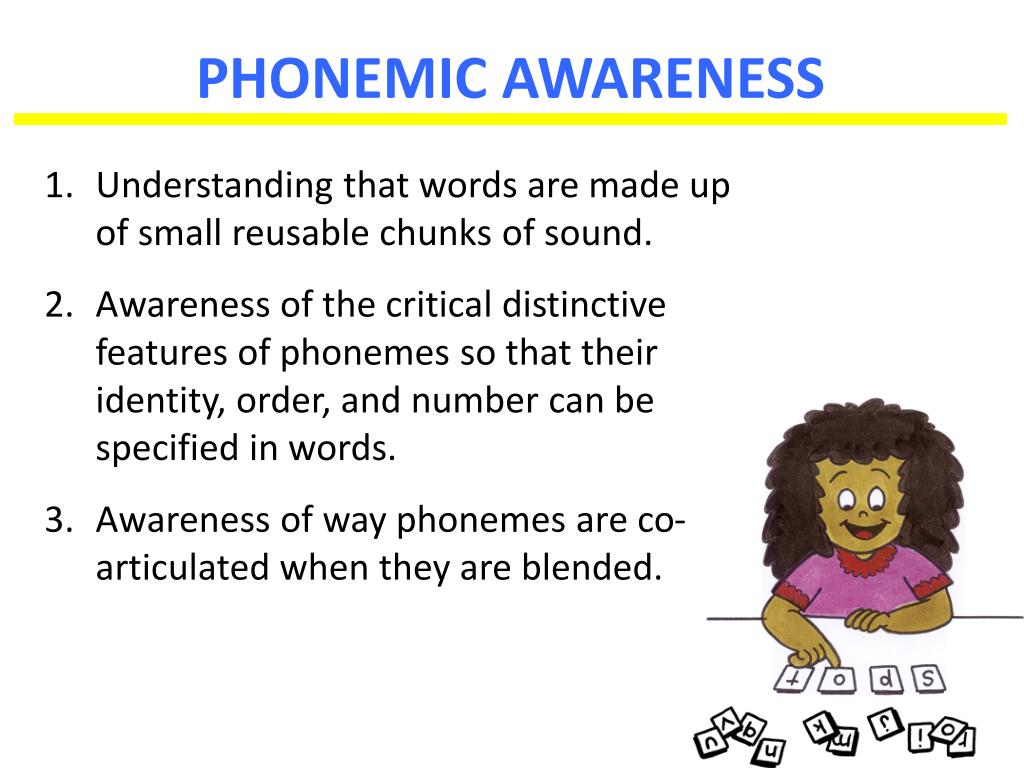 PHONEMIC AWARENESS • Understanding that words are made up of small reusable chunks of sound. • Awareness of the critical distinctive features of phonemes so that their identity, order, and number can be specified in words. • Awareness of way phonemes are co-articulated when they are blended.