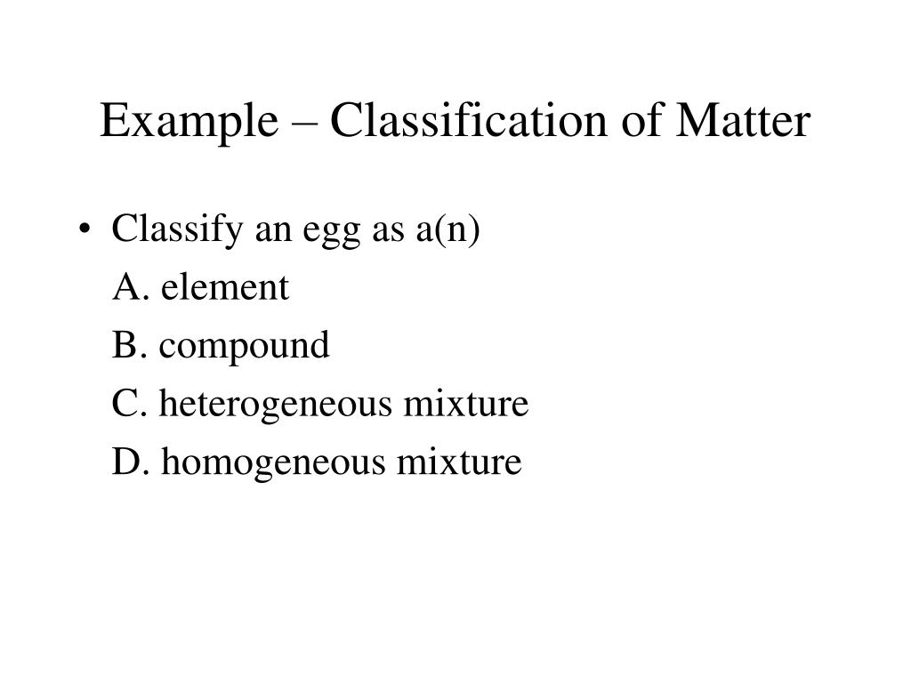 Example – Classification of Matter • Classify an egg as a(n) A. element B. compound C. heterogeneous mixture D. homogeneous mixture