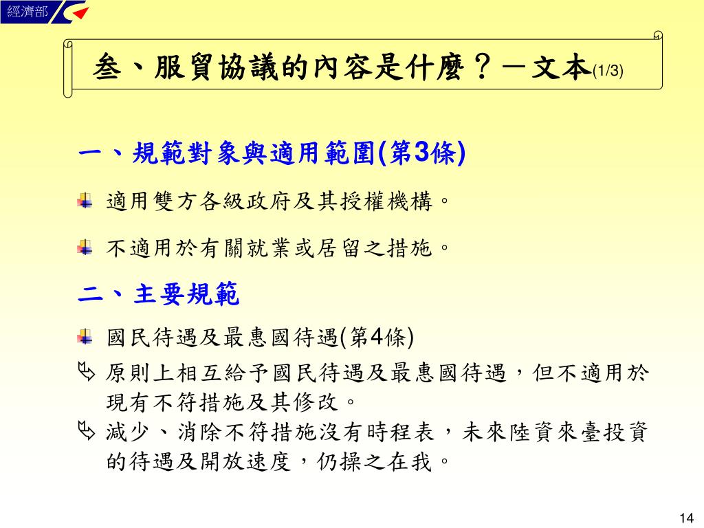 叁、服貿協議的內容是什麼?-文本(1/3) 一、規範對象與適用範圍(第3條) • 適用雙方各級政府及其授權機構。 • 不適用於有關就業或居留之措施。 二、主要規範 • 國民待遇及最惠國待遇(第4條) • 原則上相互給予國民待遇及最惠國待遇,但不適用於現有不符措施及其修改。 • 減少、消除不符措施沒有時程表,未來陸資來臺投資的待遇及開放速度,仍操之在我。