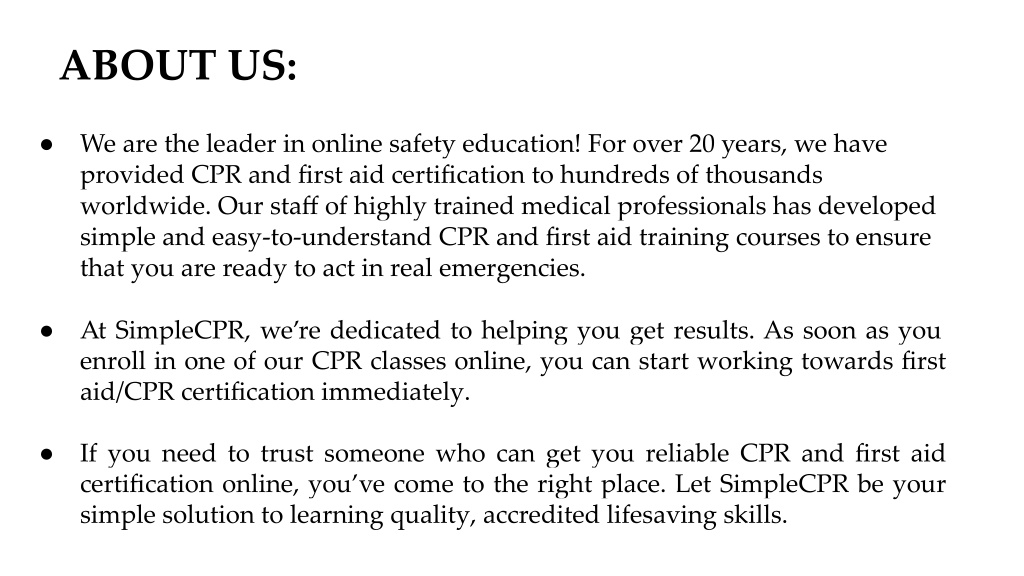 ABOUT US: ● We are the leader in online safety education! For over 20 years, we have provided CPR and first aid certification to hundreds of thousands worldwide. Our staff of highly trained medical professionals has developed simple and easy-to-understand CPR and first aid training courses to ensure that you are ready to act in real emergencies. ● At SimpleCPR, we’re dedicated to helping you get results. As soon as you enroll in one of our CPR classes online, you can start working towards first aid/CPR certification immediately. ● If you need to trust someone who can get you reliable CPR and first aid certification online, you’ve come to the right place. Let SimpleCPR be your simple solution to learning quality, accredited lifesaving skills.