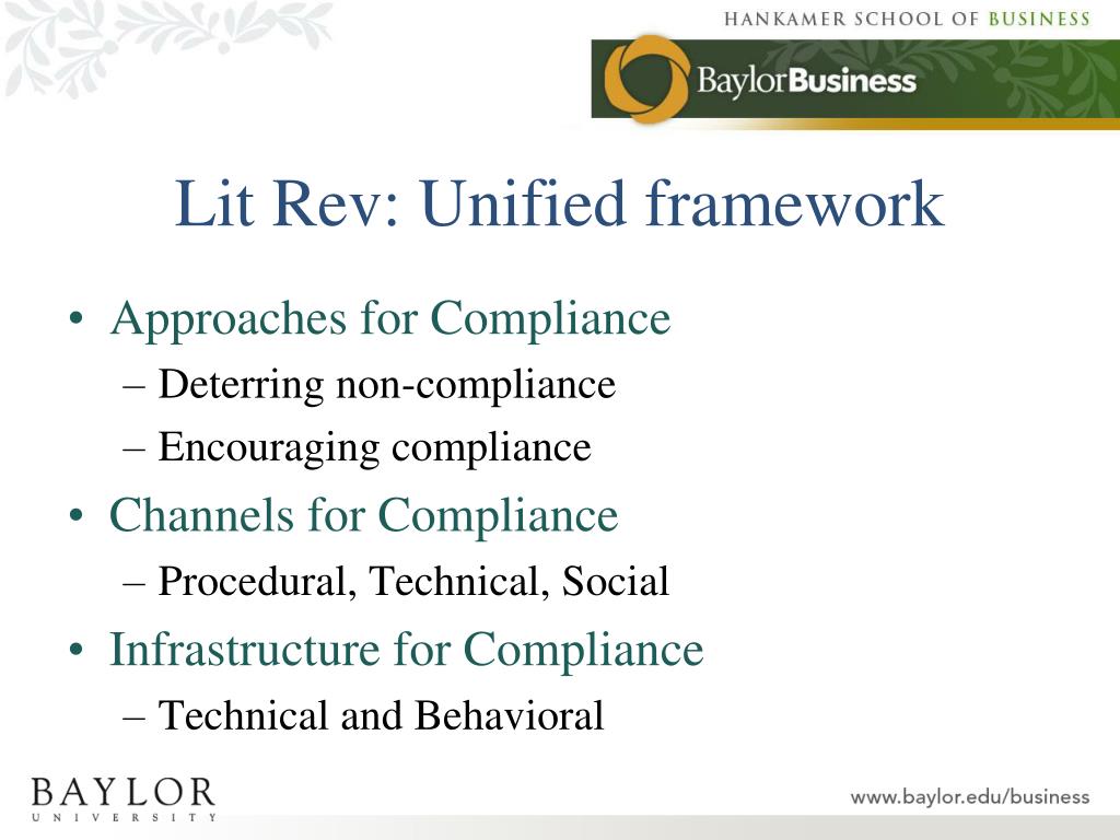 Lit Rev: Unified framework • Approaches for Compliance • Deterring non-compliance • Encouraging compliance • Channels for Compliance • Procedural, Technical, Social • Infrastructure for Compliance • Technical and Behavioral