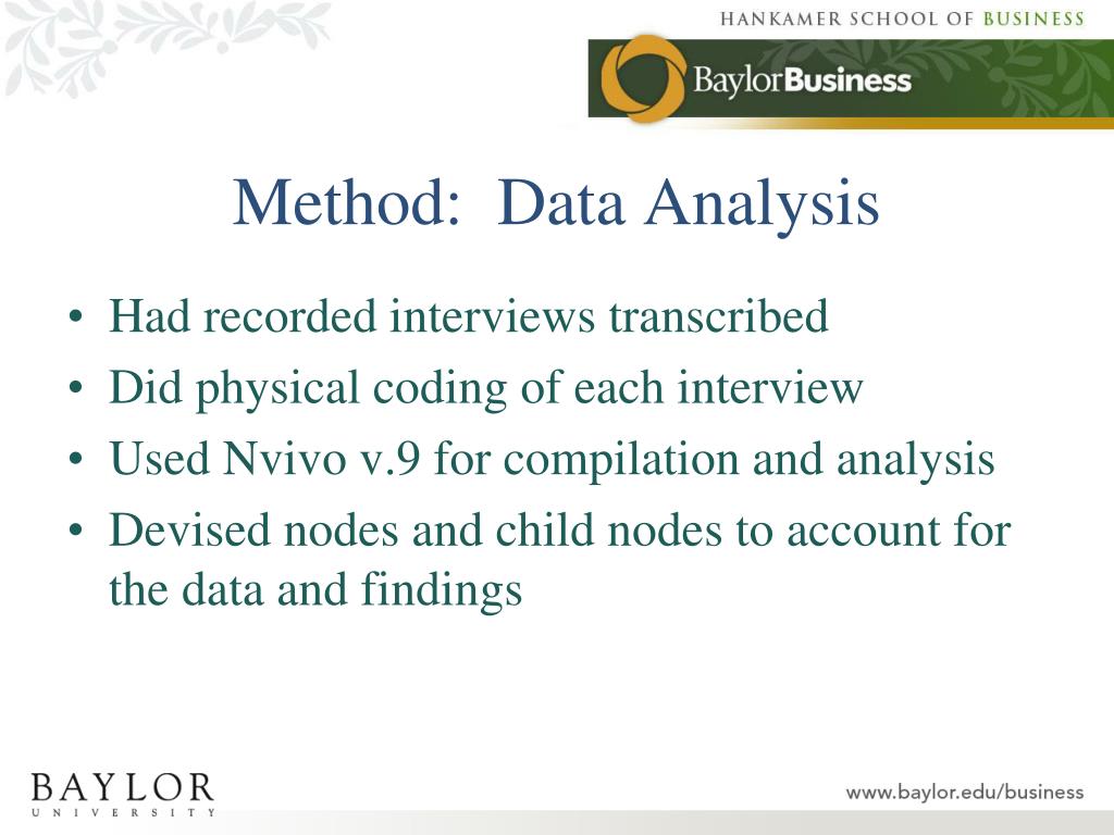 Method – Data Collection • Began with initial RQs • Gained Baylor IRB approval • Developed an initial interview guide • Sent out 24 e-mails to personal contacts in San Antonio • Of these, 10 responded affirmatively • Made two trips to San Antonio for face-to-face interviews • Used teleconference and Skype for one interview each • Recorded each interview