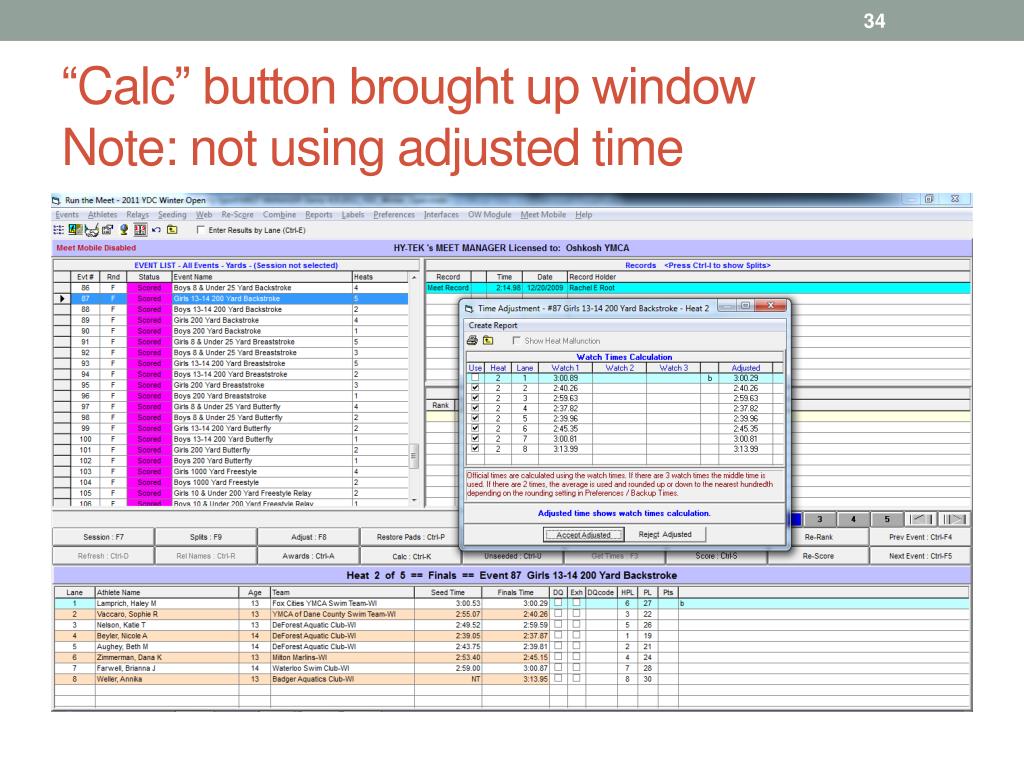 Meet Manager – Heat Malfunction • “Get Times” • “Calc” • Click “Show heat adjustment” box • Enter calculated adjusted times (done by hand) • Verify “adjusted” column is giving answer you want • Use them directly by pushing “accept adjust” button