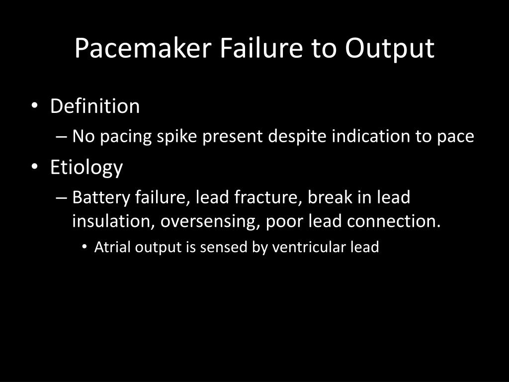 Pacemaker Failure to Output • Definition • No pacing spike present despite indication to pace • Etiology • Battery failure, lead fracture, break in lead insulation, oversensing, poor lead connection. • Atrial output is sensed by ventricular lead
