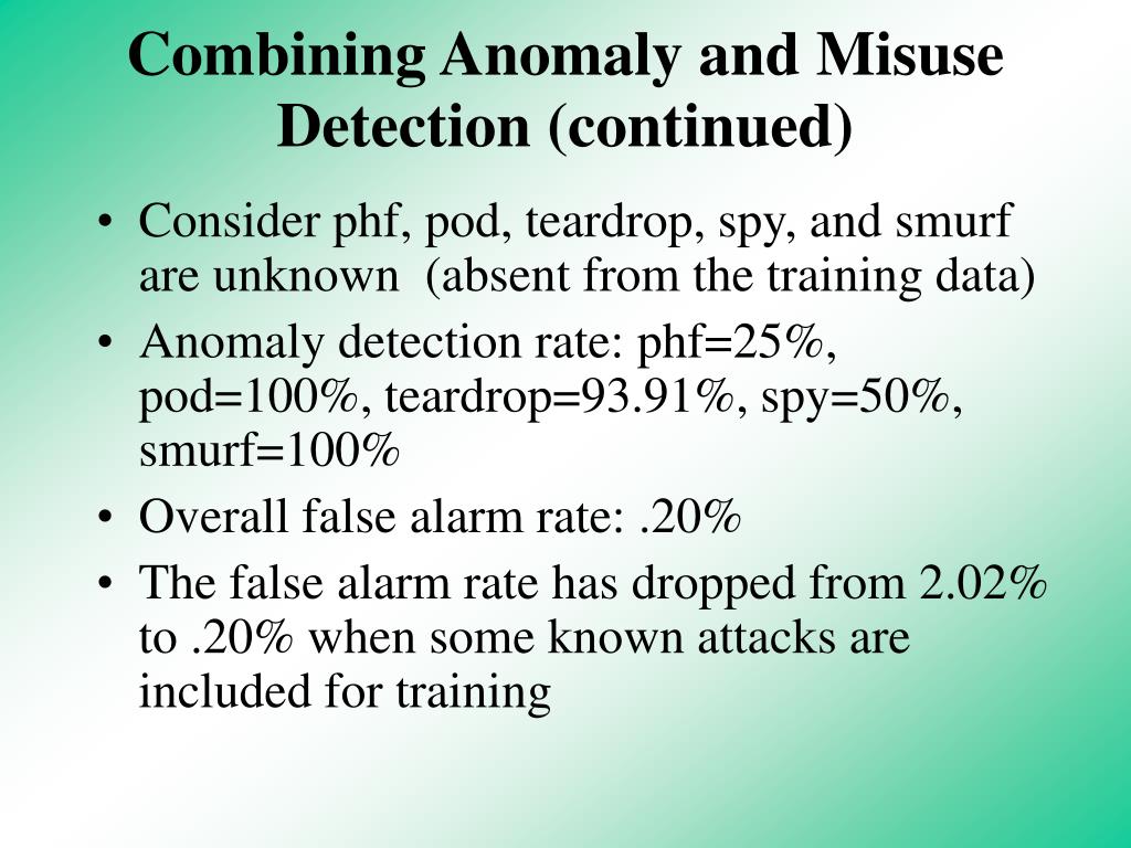 Combining Anomaly and Misuse Detection (continued) • Consider phf, pod, teardrop, spy, and smurf are unknown (absent from the training data) • Anomaly detection rate: phf=25%, pod=100%, teardrop=93.91%, spy=50%, smurf=100% • Overall false alarm rate: .20% • The false alarm rate has dropped from 2.02% to .20% when some known attacks are included for training
