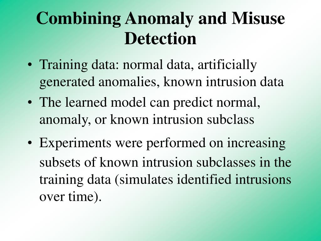 Combining Anomaly and Misuse Detection • Training data: normal data, artificially generated anomalies, known intrusion data • The learned model can predict normal, anomaly, or known intrusion subclass • Experiments were performed on increasingsubsets of known intrusion subclasses in the training data (simulates identified intrusions over time).