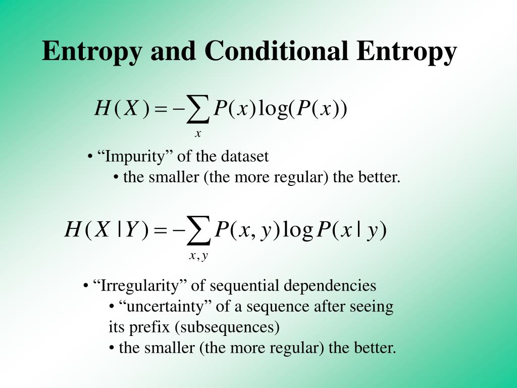 Entropy and Conditional Entropy • “Impurity” of the dataset • the smaller (the more regular) the better. • “Irregularity” of sequential dependencies • “uncertainty” of a sequence after seeing its prefix (subsequences) • the smaller (the more regular) the better.