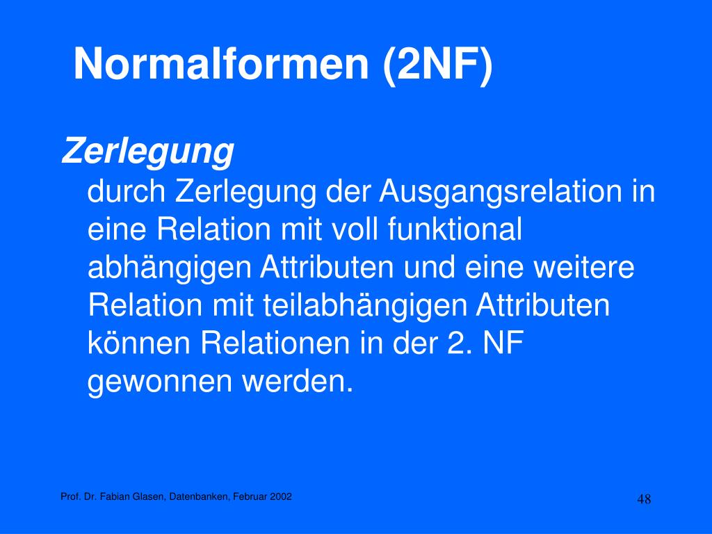 Normalformen (2NF) Zerlegungdurch Zerlegung der Ausgangsrelation in eine Relation mit voll funktional abhängigen Attributen und eine weitere Relation mit teilabhängigen Attributen können Relationen in der 2. NF gewonnen werden. Prof. Dr. Fabian Glasen, Datenbanken, Februar 2002