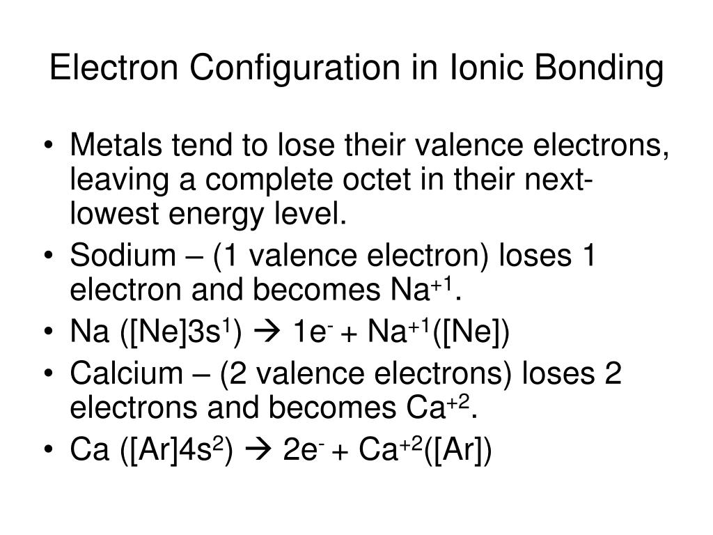 Electron Configuration in Ionic Bonding • Metals tend to lose their valence electrons, leaving a complete octet in their next-lowest energy level. • Sodium – (1 valence electron) loses 1 electron and becomes Na+1. • Na ([Ne]3s1) 1e- + Na+1([Ne]) • Calcium – (2 valence electrons) loses 2 electrons and becomes Ca+2. • Ca ([Ar]4s2) 2e- + Ca+2([Ar])
