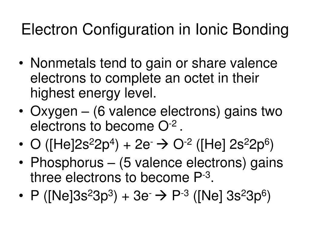 Electron Configuration in Ionic Bonding • Nonmetals tend to gain or share valence electrons to complete an octet in their highest energy level. • Oxygen – (6 valence electrons) gains two electrons to become O-2 . • O ([He]2s22p4) + 2e- O-2 ([He] 2s22p6) • Phosphorus – (5 valence electrons) gains three electrons to become P-3. • P ([Ne]3s23p3) + 3e- P-3 ([Ne] 3s23p6)