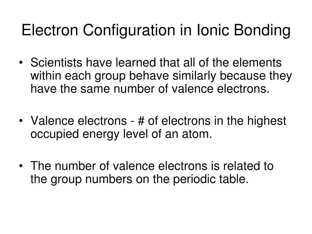 Electron Configuration in Ionic Bonding • Scientists have learned that all of the elements within each group behave similarly because they have the same number of valence electrons. • Valence electrons - # of electrons in the highest occupied energy level of an atom. • The number of valence electrons is related to the group numbers on the periodic table.