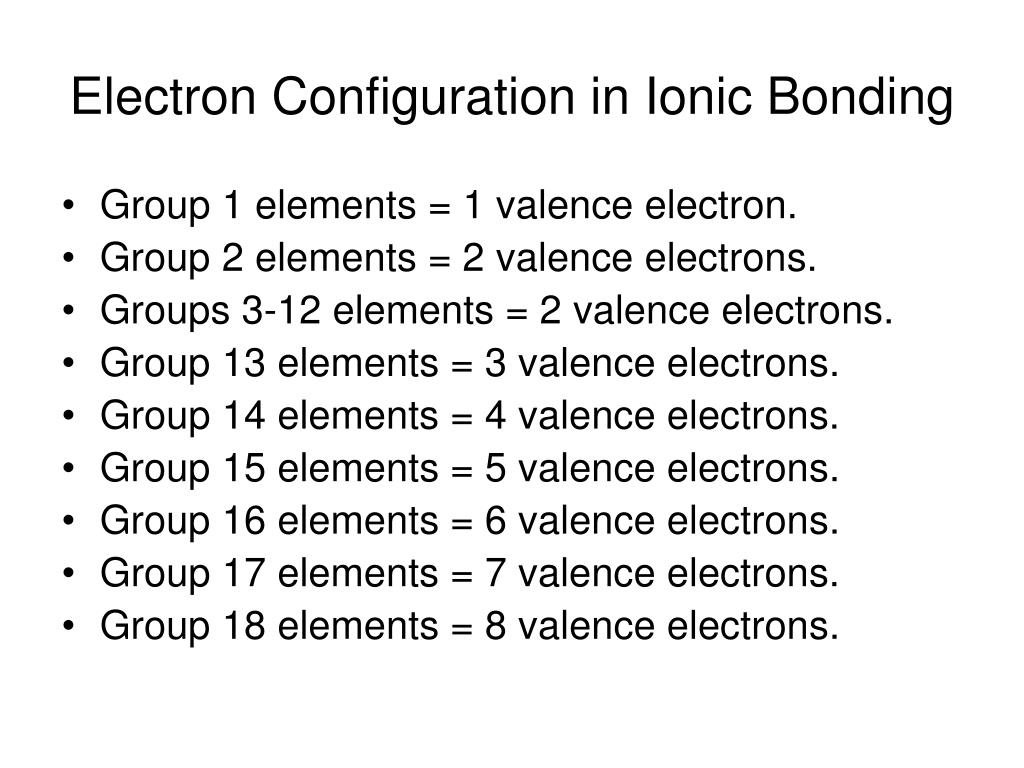 Electron Configuration in Ionic Bonding • Group 1 elements = 1 valence electron. • Group 2 elements = 2 valence electrons. • Groups 3-12 elements = 2 valence electrons. • Group 13 elements = 3 valence electrons. • Group 14 elements = 4 valence electrons. • Group 15 elements = 5 valence electrons. • Group 16 elements = 6 valence electrons. • Group 17 elements = 7 valence electrons. • Group 18 elements = 8 valence electrons.