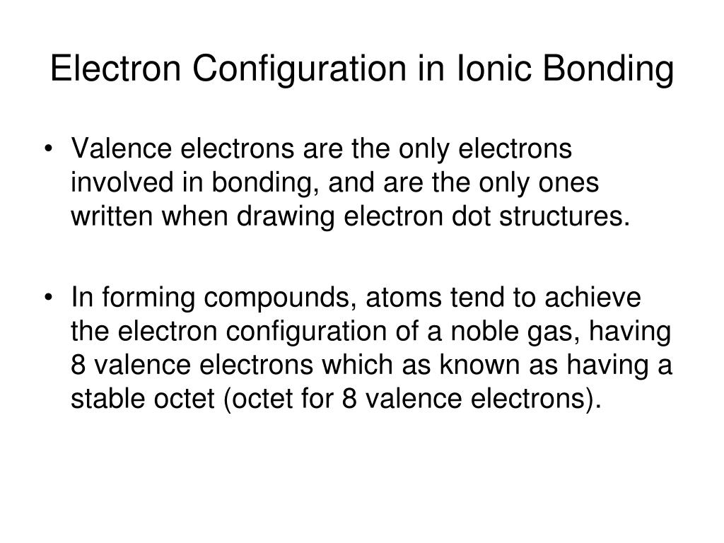 Electron Configuration in Ionic Bonding • Valence electrons are the only electrons involved in bonding, and are the only ones written when drawing electron dot structures. • In forming compounds, atoms tend to achieve the electron configuration of a noble gas, having 8 valence electrons which as known as having a stable octet (octet for 8 valence electrons).