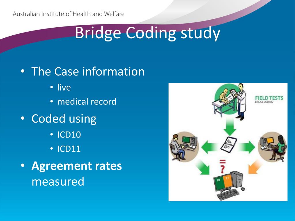Bridge Codingstudy • The Case information • live • medical record • Coded using • ICD10 • ICD11 • Agreement rates measured