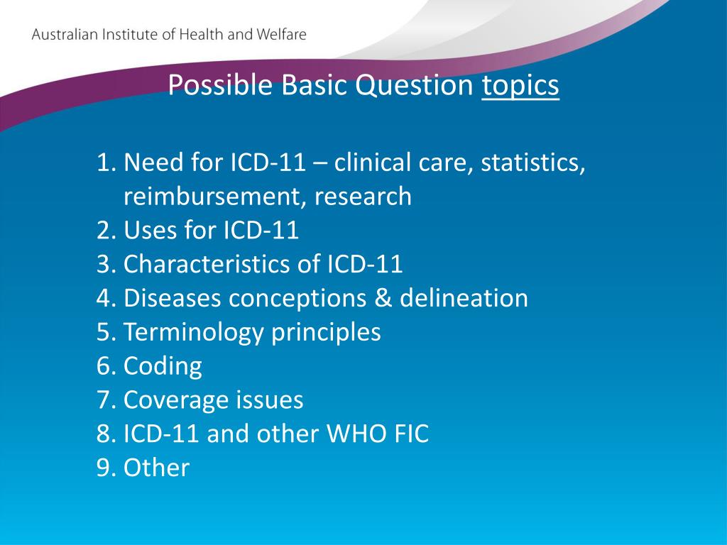Possible Basic Question topics Needfor ICD-11 – clinical care, statistics, reimbursement, research Uses for ICD-11 Characteristics of ICD-11 Diseases conceptions & delineation Terminology principles Coding Coverage issues ICD-11 and other WHO FIC Other
