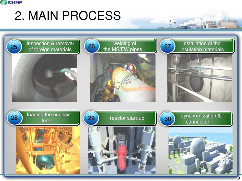 2. MAIN PROCESS 26 27 25 Installation of the insulation materials welding of the MS/FW pipes loading the nuclear fuel synchronization & connection Inspection & removal of foreign materials reactor start-up 28 29 30