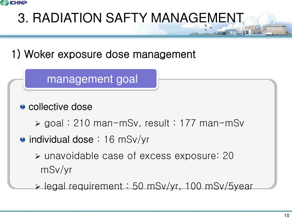 3. RADIATION SAFTY MANAGEMENT 1) Woker exposure dose management management goal • collective dose • goal: 210 man-mSv, result: 177 man-mSv • individual dose: 16 mSv/yr • unavoidable caseof excess exposure: 20 mSv/yr • legal requirement: 50 mSv/yr, 100 mSv/5year