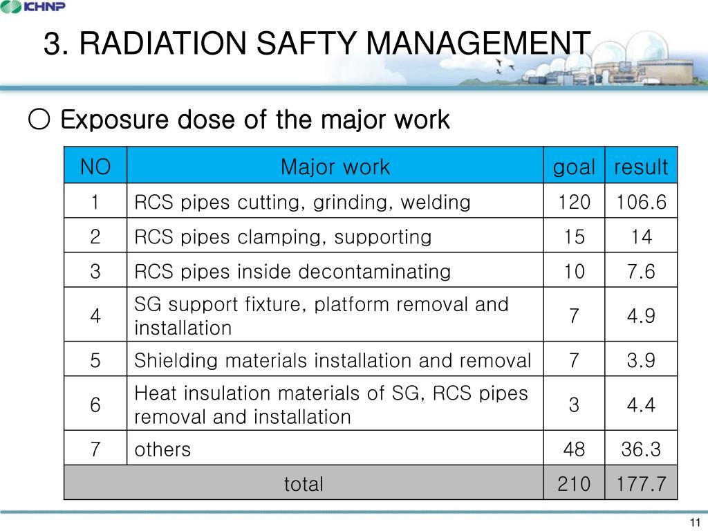 3. RADIATION SAFTY MANAGEMENT 2) Method of reducing exposure radiation dose for worker • delay the draining of SGprimary and secondary coolant • conducting pre-mock up training for major radiation work • radiation shielding : installation of temporary lead shielding materials for RCS pipes and lead shielding structure for OSG • installation of the movable air cleaning unit • monitoring continually the air contamination level(movable continuous air contamination monitor) • decontamination of the inside of RCS end pipes • measurement of radiation and radioactivity for a day, of work