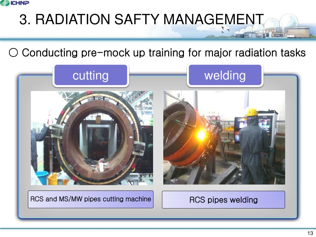 3. RADIATION SAFTY MANAGEMENT ○ Conducting pre-mock up training for major radiation tasks shielding decontamination pipe end decontamination(PED) shielding plug