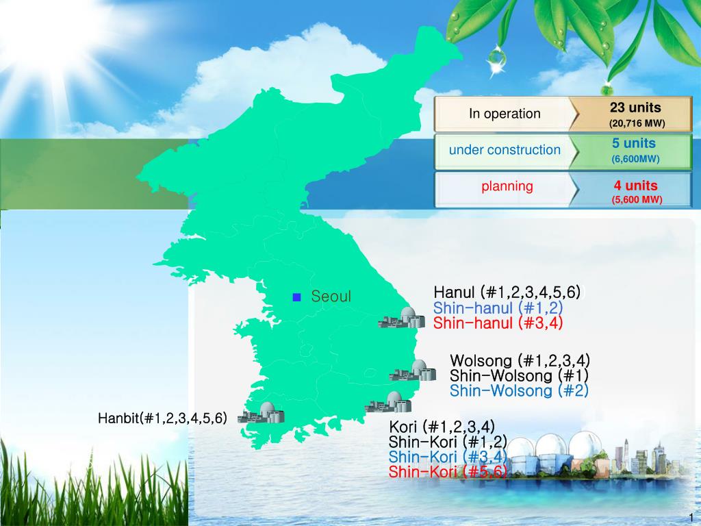 23 units (20,716 MW) In operation 5 units (6,600MW) under construction 4 units (5,600 MW) planning Hanul (#1,2,3,4,5,6)) Shin-hanul (#1,2) Shin-hanul (#3,4) Seoul Wolsong (#1,2,3,4) Shin-Wolsong (#1) Shin-Wolsong (#2) Hanbit(#1,2,3,4,5,6) Kori (#1,2,3,4) Shin-Kori (#1,2) Shin-Kori (#3,4) Shin-Kori (#5,6) Yonggwang (#1,2,3,4,5,6)