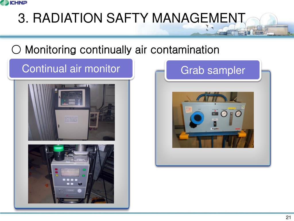 3. RADIATION SAFTY MANAGEMENT ○ Monitoring continually air contamination Continual air monitor Grab sampler