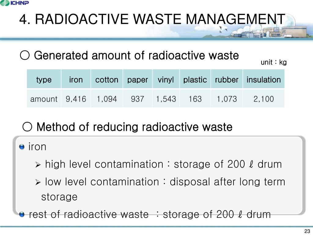 4. RADIOACTIVE WASTE MANAGEMENT ○ Generated amount of radioactive waste unit: kg ○ Method of reducing radioactive waste • iron • high level contamination: storage of 200 ℓdrum • low level contamination: disposal after long term storage • rest of radioactive waste : storage of 200 ℓdrum