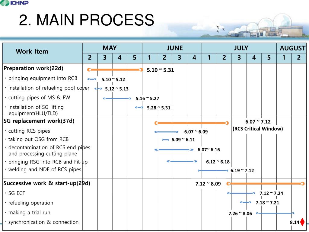 2. MAIN PROCESS JUNE JULY AUGUST Work Item 2 3 4 5 1 2 3 4 1 2 3 4 5 1 2 MAY Preparation work(22d) 5.10 ~ 5.31 ㆍbringing equipment into RCB 5.10 ~ 5.12 ㆍinstallation of refueling pool cover 5.12 ~ 5.13 ㆍcutting pipes of MS & FW 5.16 ~ 5.27 ㆍinstallation of SG lifting equipment(HLU/TLD) 5.28 ~ 5.31 SG replacement work(37d) 6.07 ~ 7.12 (RCS Critical Window) ㆍcutting RCS pipes 6.07 ~ 6.09 ㆍtaking out OSG from RCB 6.09 ~ 6.11 ㆍdecontamination of RCS end pipes and processing cutting plane 6.07~ 6.16 6.12 ~ 6.18 ㆍbringing RSG into RCB andFit-up ㆍwelding and NDE of RCS pipes 6.19 ~ 7.12 Successive work & start-up(29d) 7.12 ~ 8.09 ㆍSGECT 7.12 ~ 7.24 7.18 ~ 7.21 ㆍrefueling operation ㆍmaking a trial run 7.26 ~ 8.06 ㆍsynchronization & connection 8.14