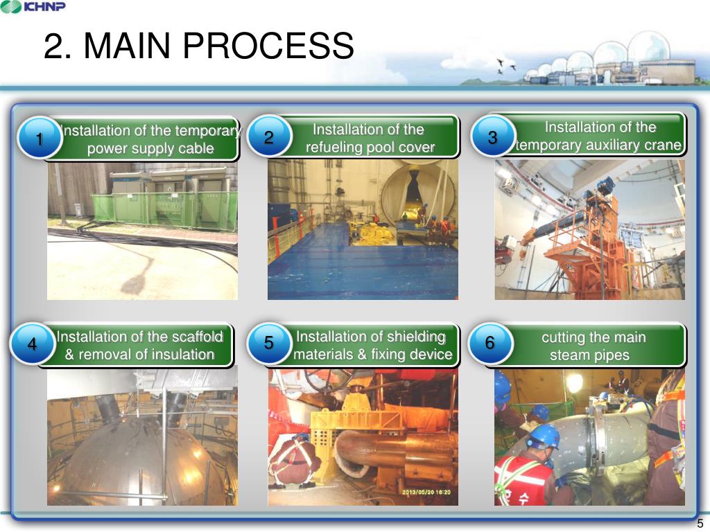 2. MAIN PROCESS 2 3 1 Installation of the temporary auxiliary crane Installation of the refueling pool cover Installation of shielding materials & fixing device Installation of the temporary power supply cable Installation of the scaffold & removal of insulation cutting the main steam pipes 5 4 6