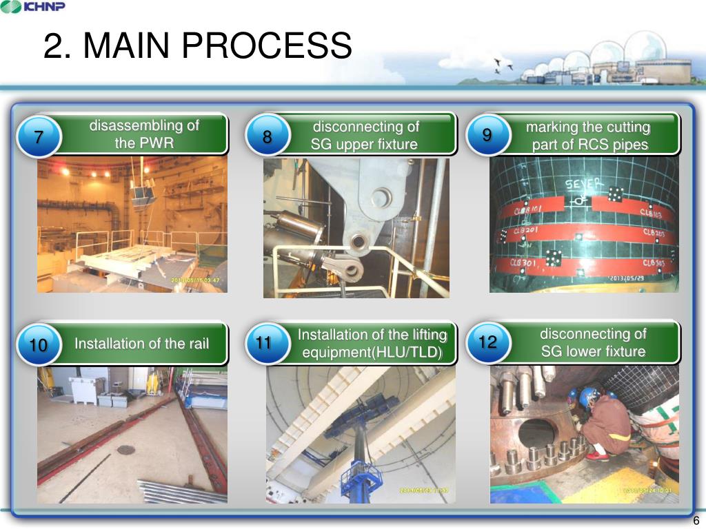 2. MAIN PROCESS 9 8 7 marking the cutting part of RCS pipes disconnecting of SG upper fixture disassembling of the PWR disconnecting of SG lower fixture Installation of the lifting equipment(HLU/TLD) Installation of the rail 12 11 10
