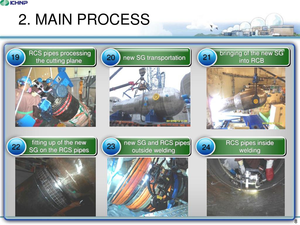 2. MAIN PROCESS 21 19 20 bringing of the new SG into RCB new SG and RCS pipes outside welding fitting up of the new SG on the RCS pipes RCS pipes processing the cutting plane RCS pipes inside welding new SG transportation 23 22 24