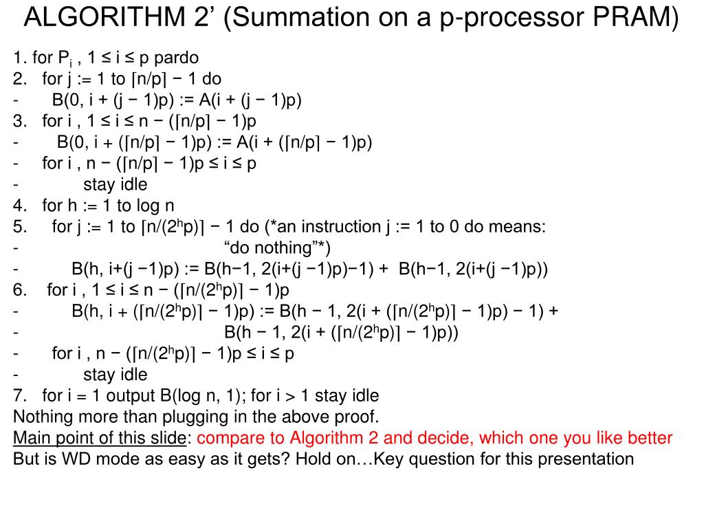 ALGORITHM 2’ (Summation on a p-processor PRAM) 1. for Pi , 1 ≤ i ≤ p pardo 2. for j := 1 to ⌈n/p⌉ − 1 do - B(0, i + (j − 1)p) := A(i + (j − 1)p) 3. for i , 1 ≤ i ≤ n − (⌈n/p⌉ − 1)p - B(0, i + (⌈n/p⌉ − 1)p) := A(i + (⌈n/p⌉ − 1)p) - for i , n − (⌈n/p⌉ − 1)p ≤ i ≤ p - stay idle 4. for h := 1 to log n 5. for j := 1 to ⌈n/(2hp)⌉ − 1 do (*an instruction j := 1 to 0 do means: - “do nothing”*) • B(h, i+(j −1)p) := B(h−1, 2(i+(j −1)p)−1) + B(h−1, 2(i+(j −1)p)) 6. for i , 1 ≤ i ≤ n − (⌈n/(2hp)⌉ − 1)p - B(h, i + (⌈n/(2hp)⌉ − 1)p) := B(h − 1, 2(i + (⌈n/(2hp)⌉ − 1)p) − 1) + - B(h − 1, 2(i + (⌈n/(2hp)⌉ − 1)p)) - for i , n − (⌈n/(2hp)⌉ − 1)p ≤ i ≤ p - stay idle • for i = 1 output B(log n, 1); for i > 1 stay idle Nothing more than plugging in the above proof. Main point of this slide: compare to Algorithm 2 and decide, which one you like better But is WD mode as easy as it gets? Hold on…Key question for this presentation