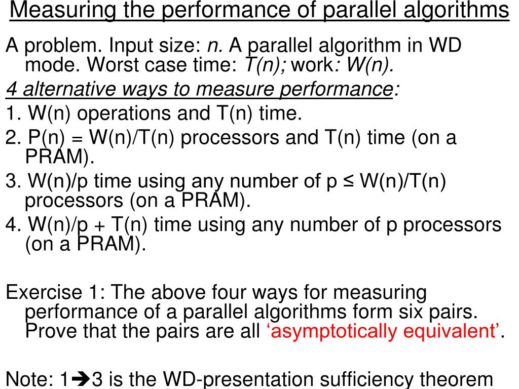 Measuring the performance of parallel algorithms A problem. Input size: n. A parallel algorithm in WD mode. Worst case time: T(n); work: W(n). 4 alternative ways to measure performance: 1. W(n) operations and T(n) time. 2. P(n) = W(n)/T(n) processors and T(n) time (on a PRAM). 3. W(n)/p time using any number of p ≤ W(n)/T(n) processors (on a PRAM). 4. W(n)/p + T(n) time using any number of p processors (on a PRAM). Exercise 1: The above four ways for measuring performance of a parallel algorithms form six pairs. Prove that the pairs are all ‘asymptotically equivalent’. Note: 13 is the WD-presentation sufficiency theorem