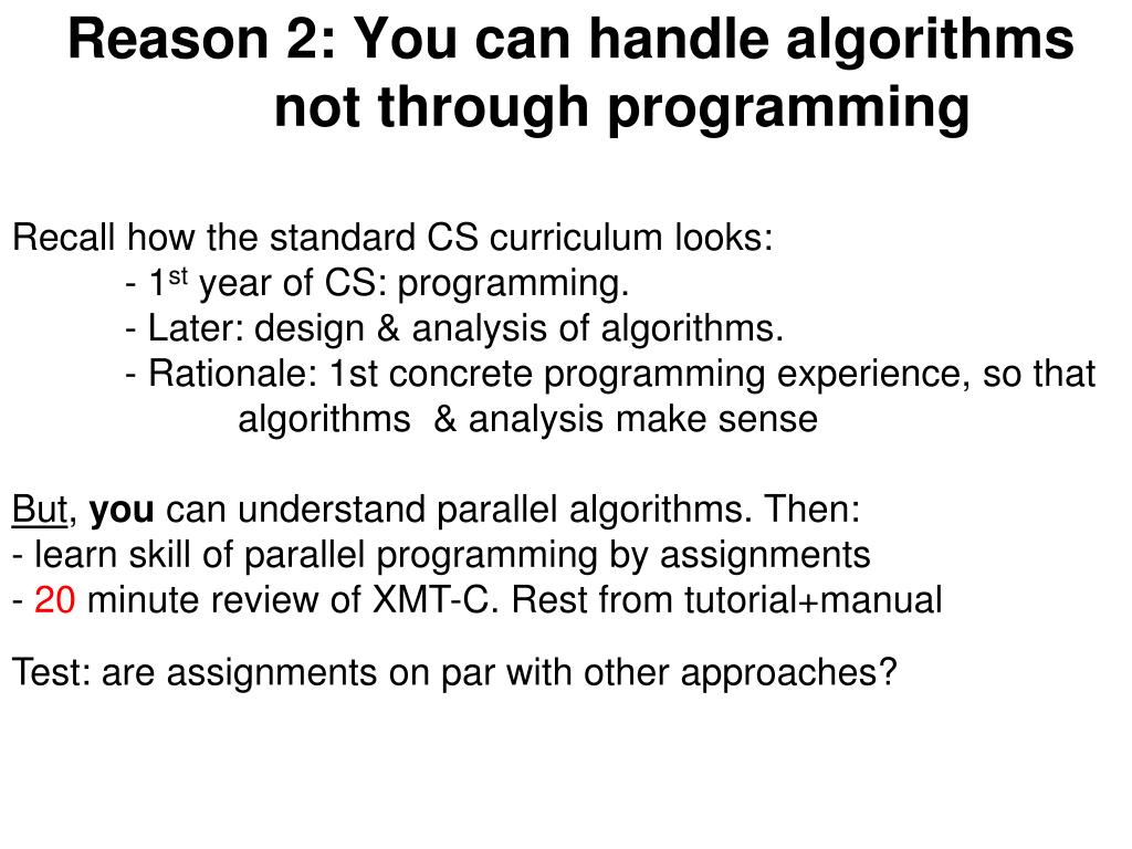 Recall how the standard CS curriculum looks: - 1st year of CS: programming. - Later: design & analysis of algorithms. - Rationale: 1st concrete programming experience, so that algorithms & analysis make sense But, you can understand parallel algorithms. Then: • learn skill of parallel programming by assignments • 20 minute review of XMT-C. Rest from tutorial+manual • Test: are assignments on par with other approaches? Reason 2: You can handle algorithms not through programming