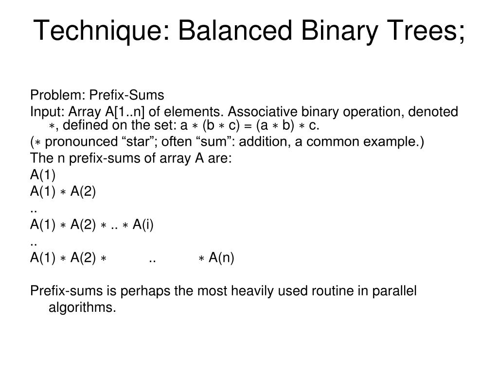 Technique: Balanced Binary Trees; Problem: Prefix-Sums Input: Array A[1..n] of elements. Associative binary operation, denoted ∗, defined on the set: a ∗ (b ∗ c) = (a ∗ b) ∗ c. (∗ pronounced “star”; often “sum”: addition, a common example.) The n prefix-sums of array A are: A(1) A(1) ∗ A(2) .. A(1) ∗ A(2) ∗ .. ∗ A(i) .. A(1) ∗ A(2) ∗ .. ∗ A(n) Prefix-sums is perhaps the most heavily used routine in parallel algorithms.