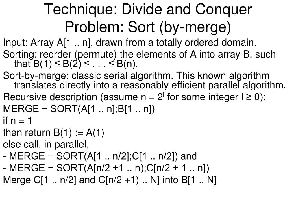 Technique: Divide and Conquer Problem: Sort (by-merge) Input: Array A[1 .. n], drawn from a totally ordered domain. Sorting: reorder (permute) the elements of A into array B, such that B(1) ≤ B(2) ≤ . . . ≤ B(n). Sort-by-merge: classic serial algorithm. This known algorithm translates directly into a reasonably efficient parallel algorithm. Recursive description (assume n = 2l for some integer l ≥ 0): MERGE − SORT(A[1 .. n];B[1 .. n]) if n = 1 then return B(1) := A(1) else call, in parallel, - MERGE − SORT(A[1 .. n/2];C[1 .. n/2]) and - MERGE − SORT(A[n/2 +1 .. n);C[n/2 + 1 .. n]) Merge C[1 .. n/2] and C[n/2 +1) .. N] into B[1 .. N]