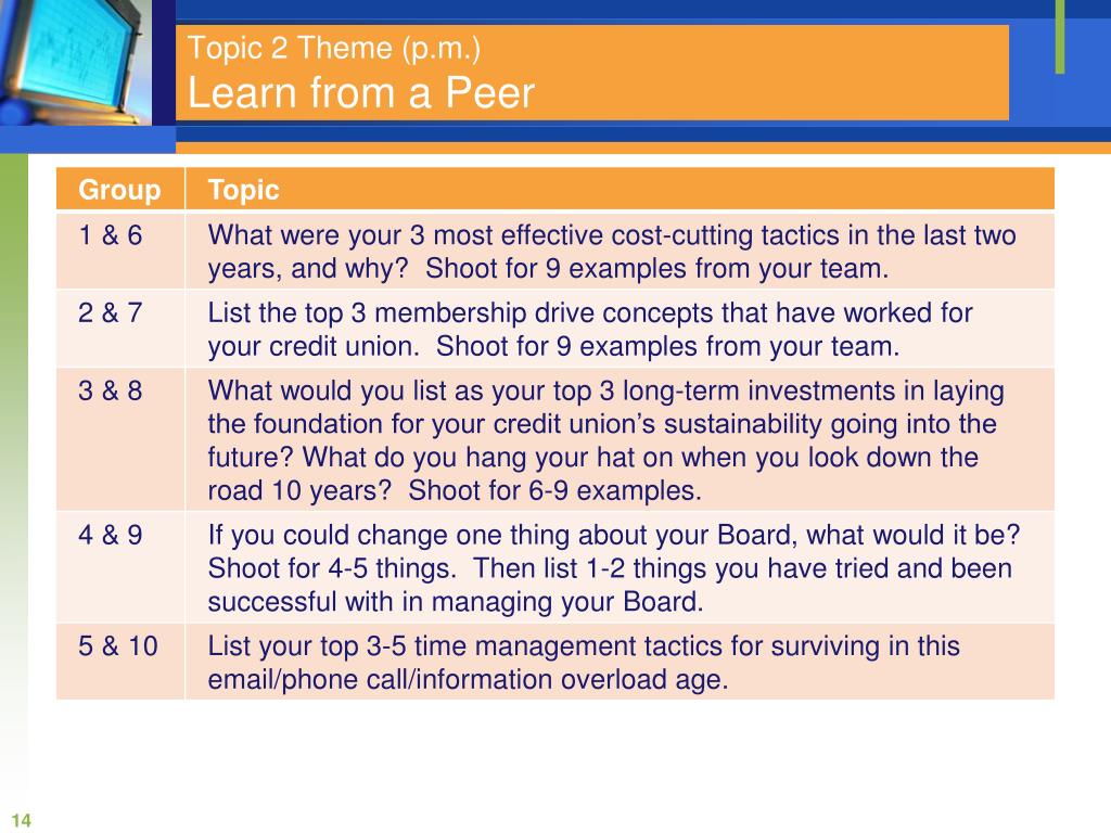 Your Assignment, Mr. Phelps... Topic 1 Theme (a.m.) Collaborative Opportunity Topic 2 Theme (p.m.) Learn From a Peer Everybody talks “best practices” but seldom do you have a chance to relate best practice around such a common base of resources and capabilities We have an opportunity to leave this room with an idea, a mentor for the idea, and some common tools that should speed an idea to reality in our operations Learning from a peer is a skill, and a competitive advantage • Group discussion topics for this morning were selected to get the groups focused on the power of our network and the possibilities for expanding what we might do together • Whether it be the entire CUSO, or just small groups within the CUSO, or even something you would do with only one other partner...what business opportunities are out there?