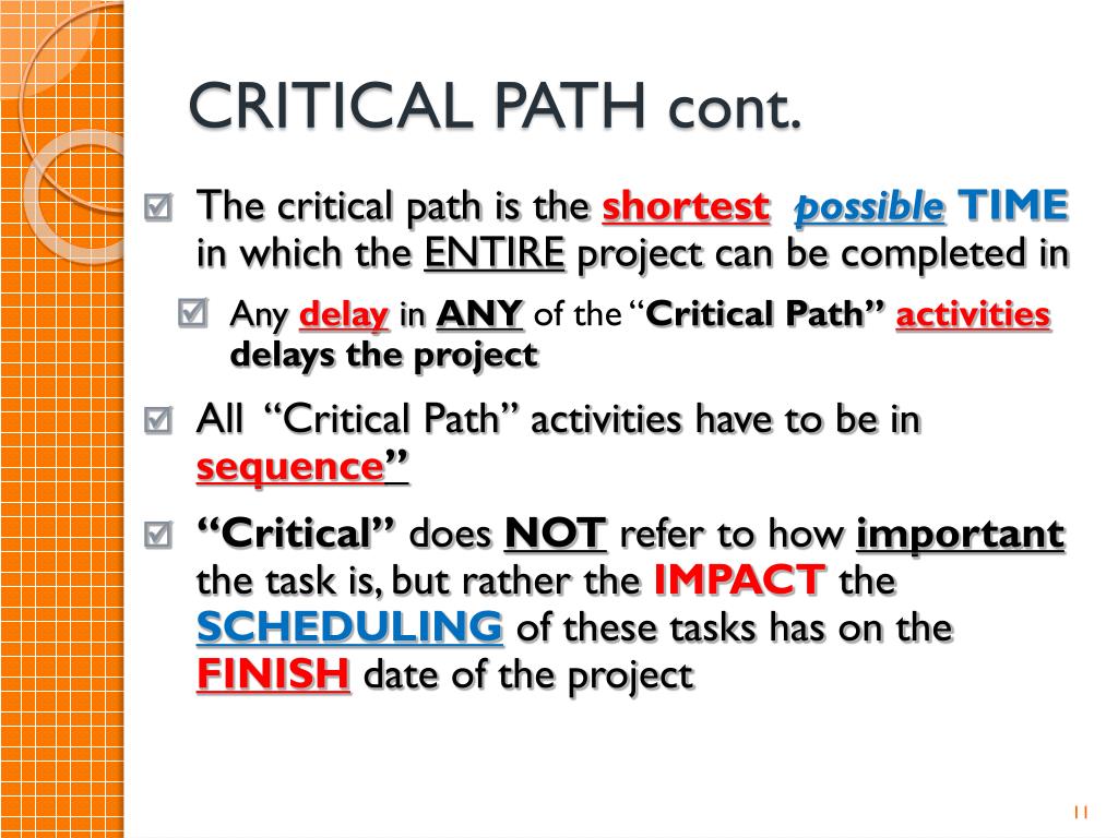 CRITICAL PATH cont. • The critical path is the shortestpossibleTIME in which the ENTIRE project can be completed in • Any delay in ANYof the “Critical Path” activitiesdelays the project • All “Critical Path” activities have to be in sequence” • “Critical” does NOT refer to how important the task is, but rather the IMPACT the SCHEDULING of these tasks has on the FINISH date of the project