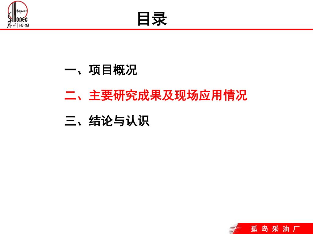 目录 一、项目概况 二、主要研究成果及现场应用情况 三、结论与认识 孤 岛 采 油 厂