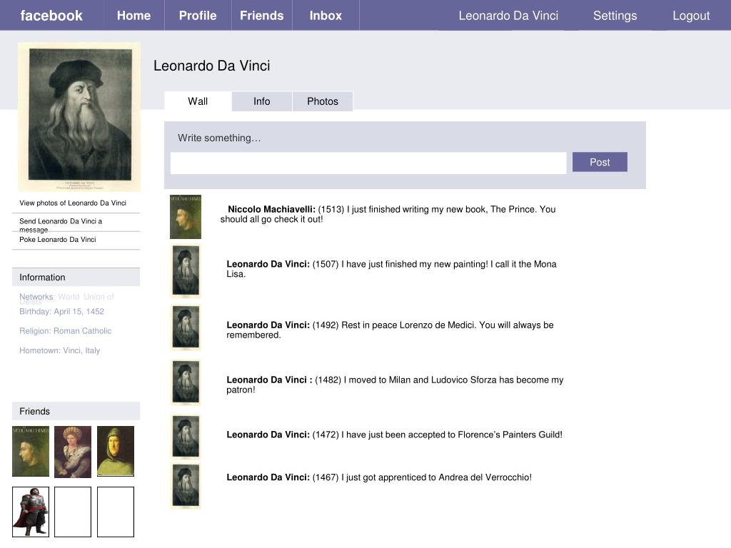 Home. Profile. Friends. Inbox. Leonardo Da Vinci. Settings. Logout. Wall. Info. Photos. Write something…. Post. facebook. View photos of Leonardo Da Vinci. Niccolo Machiavelli: (1513) I just finished writing my new book, The Prince. You should all go check it out!.