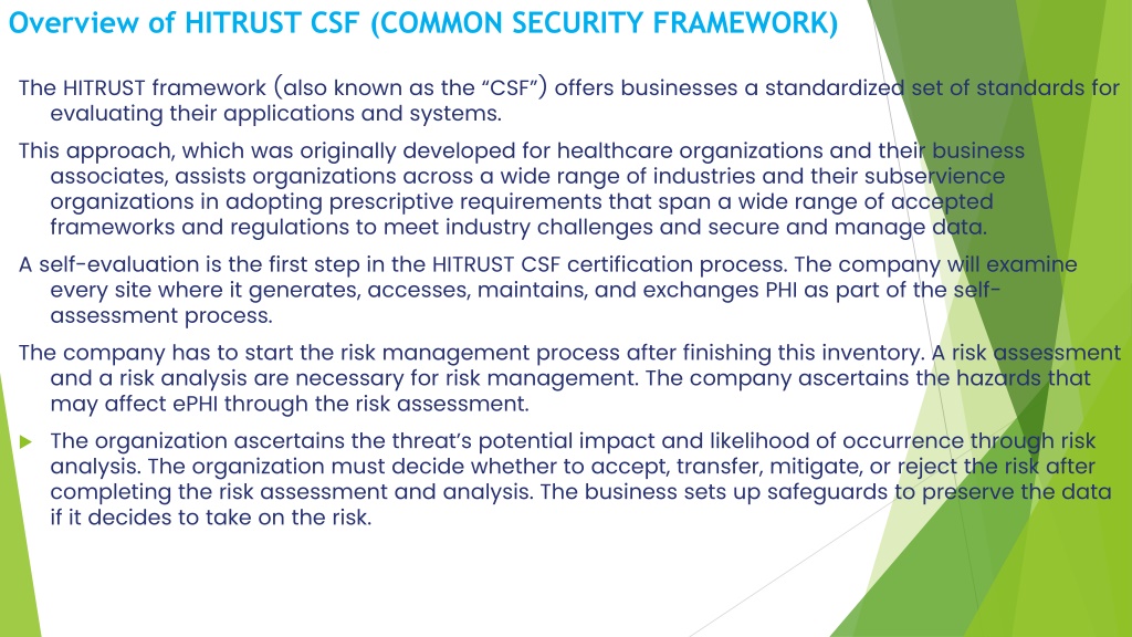 Overview of HITRUST CSF (COMMON SECURITY FRAMEWORK) The HITRUST framework (also known as the “CSF”) offers businesses a standardized set of standards for evaluating their applications and systems. This approach, which was originally developed for healthcare organizations and their business associates, assists organizations across a wide range of industries and their subservience organizations in adopting prescriptive requirements that span a wide range of accepted frameworks and regulations to meet industry challenges and secure and manage data. A self-evaluation is the first step in the HITRUST CSF certification process. The company will examine every site where it generates, accesses, maintains, and exchanges PHI as part of the self-assessment process. The company has to start the risk management process after finishing this inventory. A risk assessment and a risk analysis are necessary for risk management. The company ascertains the hazards that may affect ePHI through the risk assessment. • The organization ascertains the threat’s potential impact and likelihood of occurrence through risk analysis. The organization must decide whether to accept, transfer, mitigate, or reject the risk after completing the risk assessment and analysis. The business sets up safeguards to preserve the data if it decides to take on the risk.