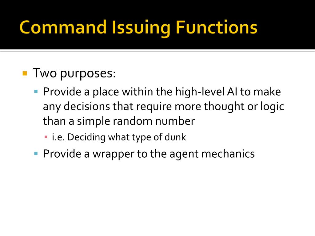 Command Issuing Functions • Two purposes: • Provide a place within the high-level AI to make any decisions that require more thought or logic than a simple random number • i.e. Deciding what type of dunk • Provide a wrapper to the agent mechanics