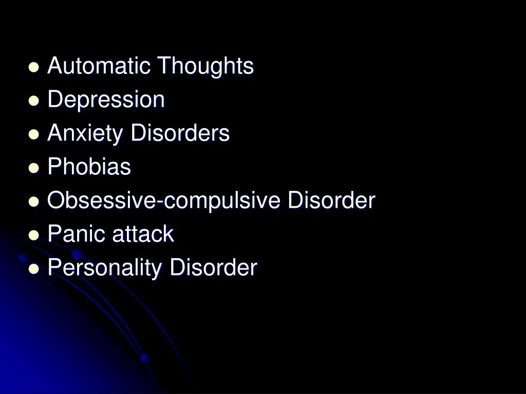 Automatic Thoughts • Depression • Anxiety Disorders • Phobias • Obsessive-compulsive Disorder • Panic attack • Personality Disorder