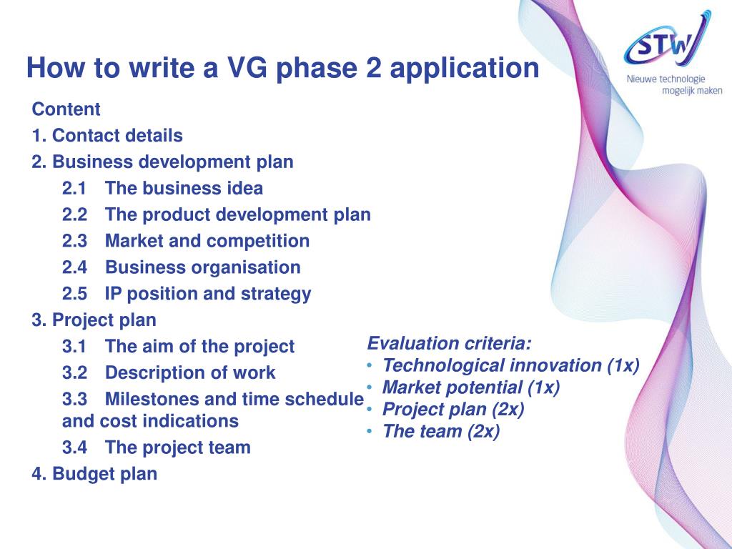 How towrite a VG phase 2 application Content 1. Contact details 2. Business development plan 2.1 The business idea 2.2 The product development plan 2.3 Market andcompetition 2.4 Business organisation 2.5 IP positionandstrategy 3. Project plan 3.1 The aim of the project 3.2 Description of work 3.3 Milestonesand time scheduleandcostindications 3.4 The project team 4. Budget plan • Evaluation criteria: • Technologicalinnovation (1x) • Market potential (1x) • Project plan (2x) • The team (2x)