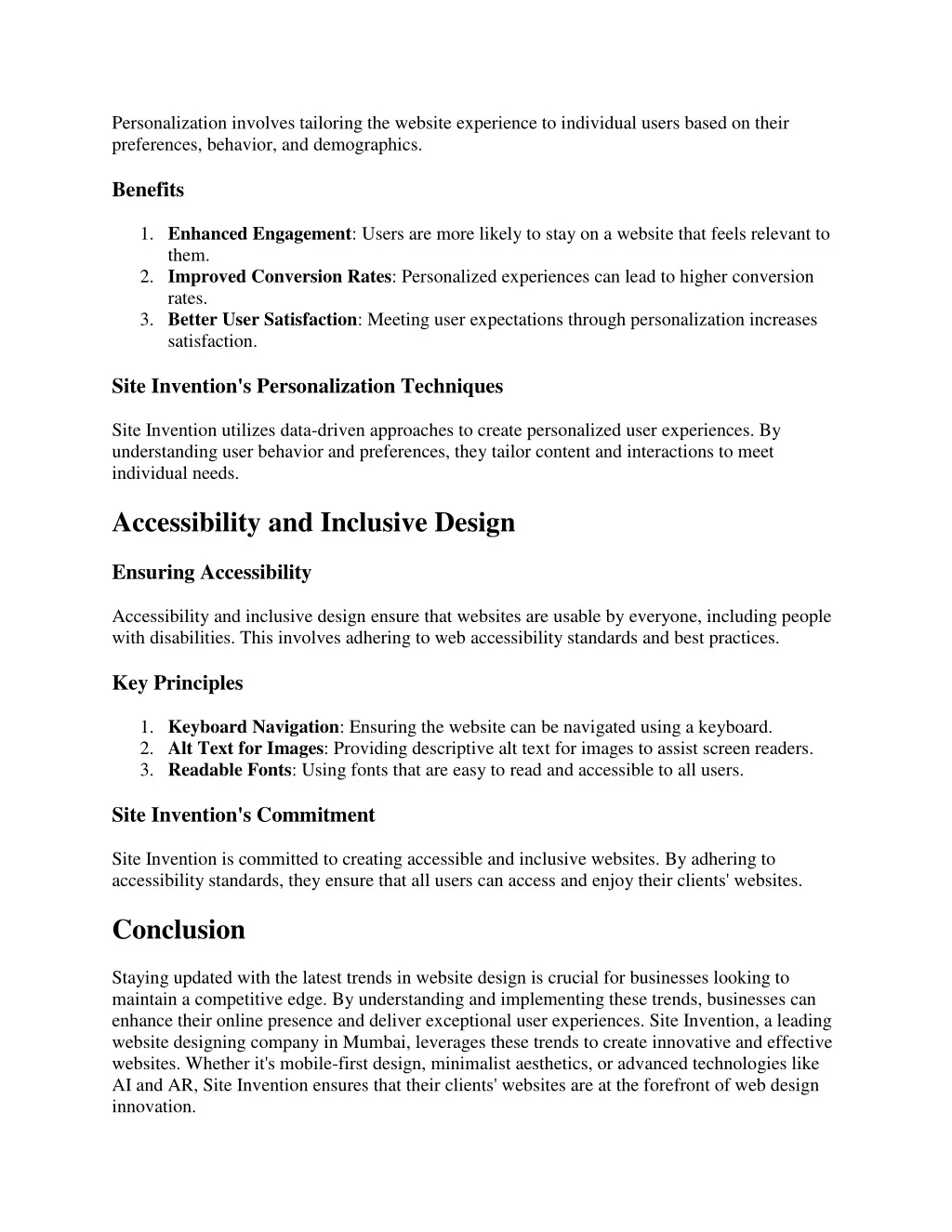 Personalization involves tailoring the website experience to individual users based on their preferences, behavior, and demographics. Benefits 1.Enhanced Engagement: Users are more likely to stay on a website that feels relevant to them. 2.Improved Conversion Rates: Personalized experiences can lead to higher conversion rates. 3.Better User Satisfaction: Meeting user expectations through personalization increases satisfaction. Site Invention's Personalization Techniques Site Invention utilizes data-driven approaches to create personalized user experiences. By understanding user behavior and preferences, they tailor content and interactions to meet individual needs. Accessibility and Inclusive Design Ensuring Accessibility Accessibility and inclusive design ensure that websites are usable by everyone, including people with disabilities. This involves adhering to web accessibility standards and best practices. Key Principles 1.Keyboard Navigation: Ensuring the website can be navigated using a keyboard. 2.Alt Text for Images: Providing descriptive alt text for images to assist screen readers. 3.Readable Fonts: Using fonts that are easy to read and accessible to all users. Site Invention's Commitment Site Invention is committed to creating accessible and inclusive websites. By adhering to accessibility standards, they ensure that all users can access and enjoy their clients' websites. Conclusion Staying updated with the latest trends in website design is crucial for businesses looking to maintain a competitive edge. By understanding and implementing these trends, businesses can enhance their online presence and deliver exceptional user experiences. Site Invention, a leading website designing company in Mumbai, leverages these trends to create innovative and effective websites. Whether it's mobile-first design, minimalist aesthetics, or advanced technologies like AI and AR, Site Invention ensures that their clients' websites are at the forefront of web design innovation.