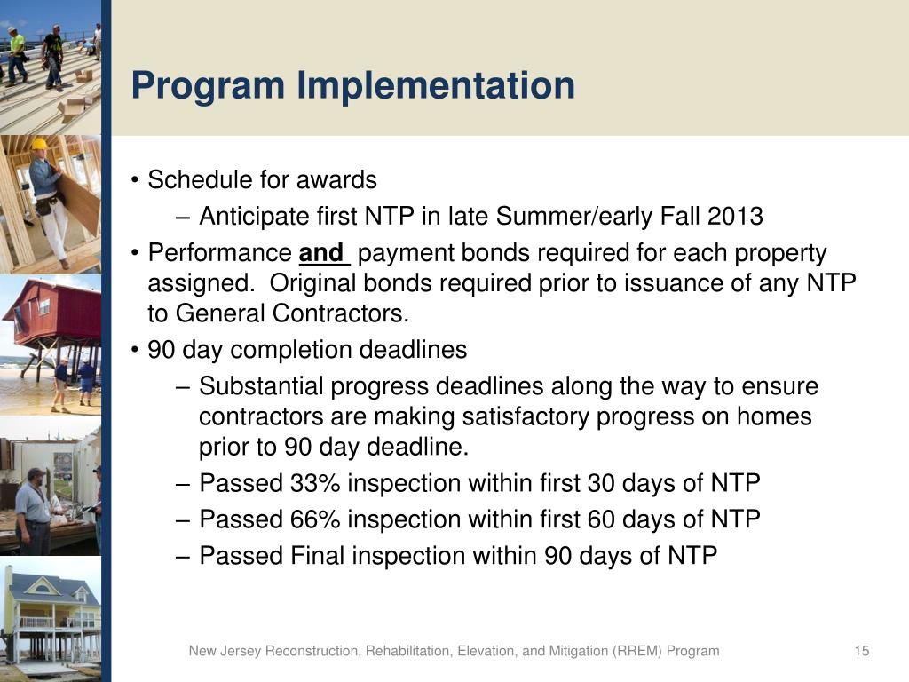 Program Implementation • Schedule for awards • Anticipate first NTP in late Summer/early Fall 2013 • Performance and payment bonds required for each property assigned. Original bonds required prior to issuance of any NTP to General Contractors. • 90 day completion deadlines • Substantial progress deadlines along the way to ensure contractors are making satisfactory progress on homes prior to 90 day deadline. • Passed 33% inspection within first 30 days of NTP • Passed 66% inspection within first 60 days of NTP • Passed Final inspection within 90 days of NTP New Jersey Reconstruction, Rehabilitation, Elevation, and Mitigation (RREM) Program