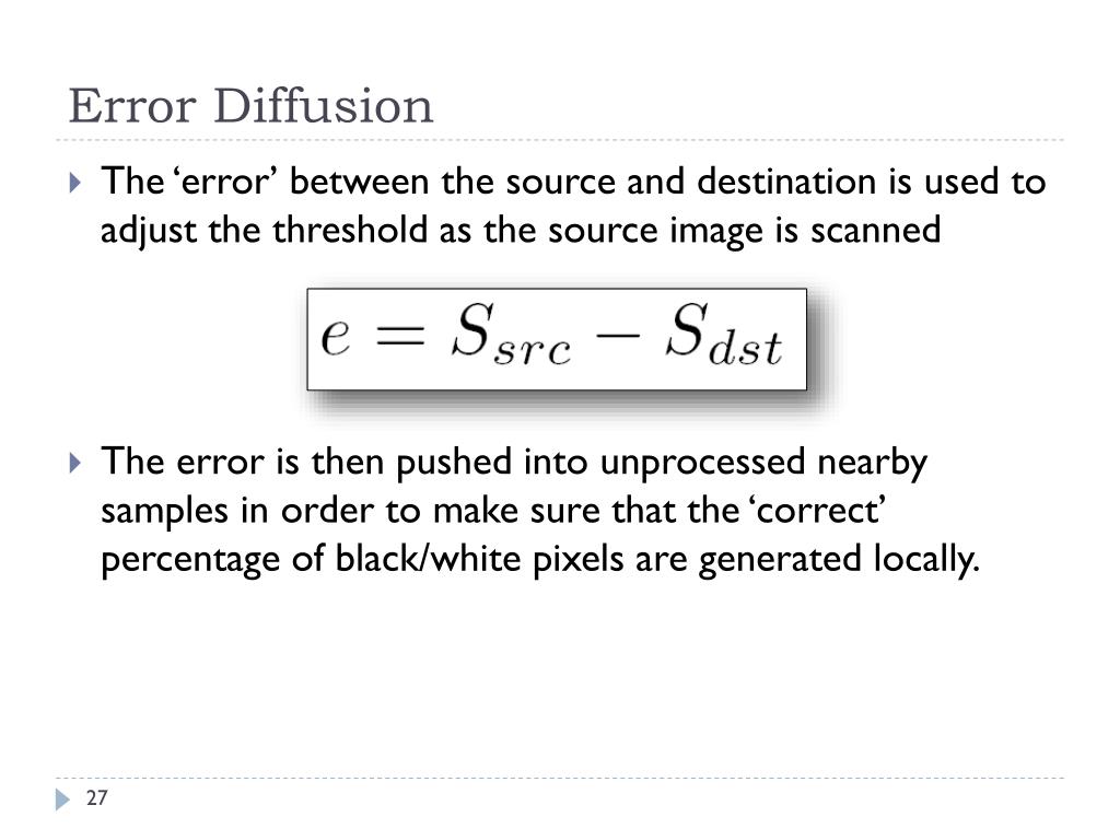 Error Diffusion • The ‘error’ between the source and destination is used to adjust the threshold as the source image is scanned • The error is then pushed into unprocessed nearby samples in order to make sure that the ‘correct’ percentage of black/white pixels are generated locally.