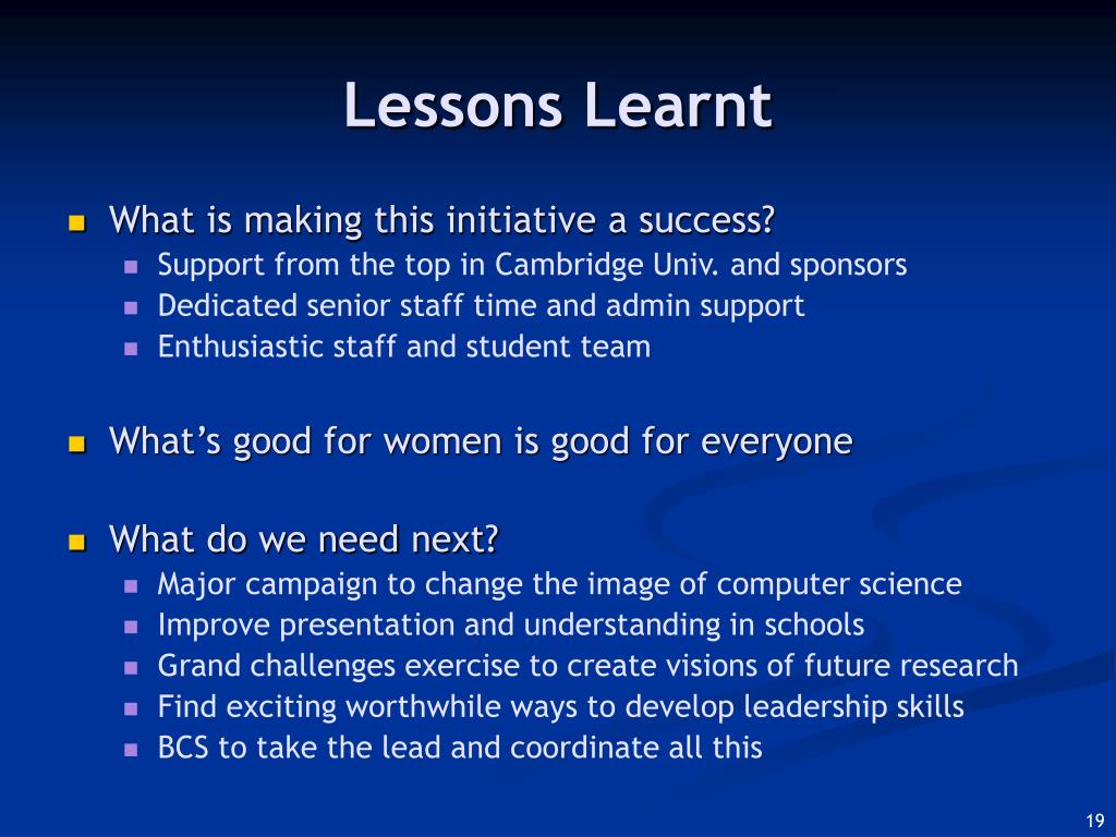 Lessons Learnt • What is making this initiative a success? • Support from the top in Cambridge Univ. and sponsors • Dedicated senior staff time and admin support • Enthusiastic staff and student team • What’s good for women is good for everyone • What do we need next? • Major campaign to change the image of computer science • Improve presentation and understanding in schools • Grand challenges exercise to create visions of future research • Find exciting worthwhile ways to develop leadership skills • BCS to take the lead and coordinate all this