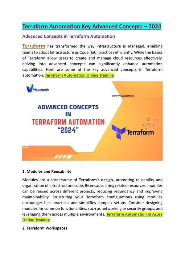 Terraform Automation Key Advanced Concepts – 2024 Advanced Concepts in Terraform Automation Terraform has transformed the way infrastructure is managed, enabling teams to adopt Infrastructure as Code (IaC) practices efficiently. While the basics of Terraform allow users to create and manage cloud resources effectively, delving into advanced concepts can significantly enhance automation capabilities. Here are some of the key advanced concepts in Terraform automation. Terraform Automation Online Training 1. Modules and Reusability Modules are a cornerstone of Terraform's design, promoting reusability and organization of infrastructure code. By encapsulating related resources, modules can be reused across different projects, reducing redundancy and improving maintainability. Structuring your Terraform configurations using modules encourages best practices and simplifies complex setups. Consider designing modules for common functionalities, such as networking or security groups, and leveraging them across multiple environments. Terraform Automation in Azure Online Training 2. Terraform Workspaces