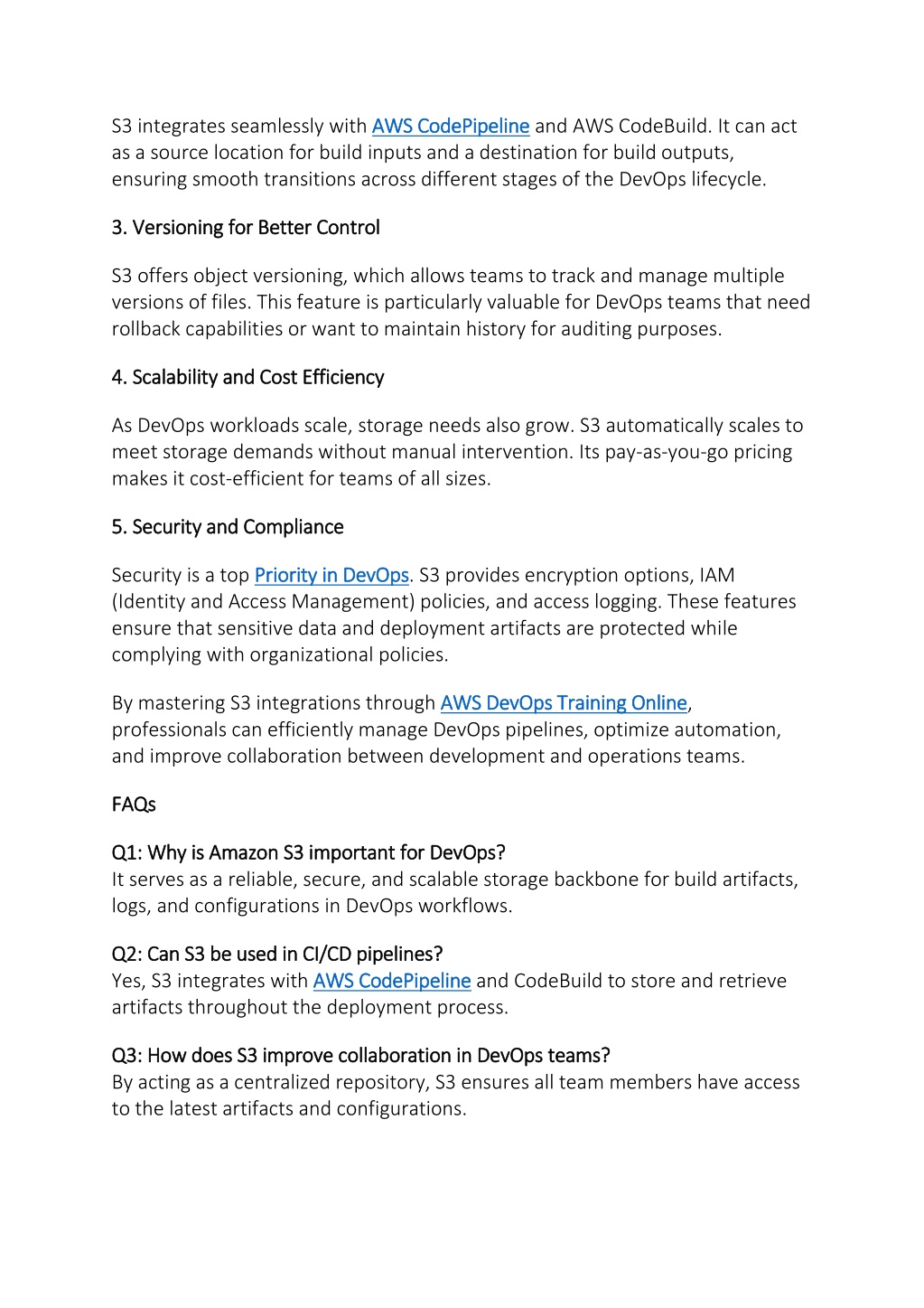 S3 integrates seamlessly with AWS CodePipeline as a source location for build inputs and a destination for build outputs, ensuring smooth transitions across different stages of the DevOps lifecycle. AWS CodePipeline and AWS CodeBuild. It can act 3. Versioning for Better Control 3. Versioning for Better Control S3 offers object versioning, which allows teams to track and manage multiple versions of files. This feature is particularly valuable for DevOps teams that need rollback capabilities or want to maintain history for auditing purposes. 4. Scalability and Cost Efficiency 4. Scalability and Cost Efficiency As DevOps workloads scale, storage needs also grow. S3 automatically scales to meet storage demands without manual intervention. Its pay-as-you-go pricing makes it cost-efficient for teams of all sizes. 5. Security and Compliance 5. Security and Compliance Security is a top Priority in DevOps Priority in DevOps. S3 provides encryption options, IAM (Identity and Access Management) policies, and access logging. These features ensure that sensitive data and deployment artifacts are protected while complying with organizational policies. By mastering S3 integrations through AWS DevOps Training Online professionals can efficiently manage DevOps pipelines, optimize automation, and improve collaboration between development and operations teams. AWS DevOps Training Online, FAQs FAQs Q1: Why is Amazon S3 important for DevOps? Q1: Why is Amazon S3 important for DevOps? It serves as a reliable, secure, and scalable storage backbone for build artifacts, logs, and configurations in DevOps workflows. Q2: Can S3 be used Q2: Can S3 be used in CI/CD pipelines? Yes, S3 integrates with AWS CodePipeline artifacts throughout the deployment process. in CI/CD pipelines? AWS CodePipeline and CodeBuild to store and retrieve Q3: How does S3 improve Q3: How does S3 improve collaboration in DevOps teams? collaboration in DevOps teams? By acting as a centralized repository, S3 ensures all team members have access to the latest artifacts and configurations.