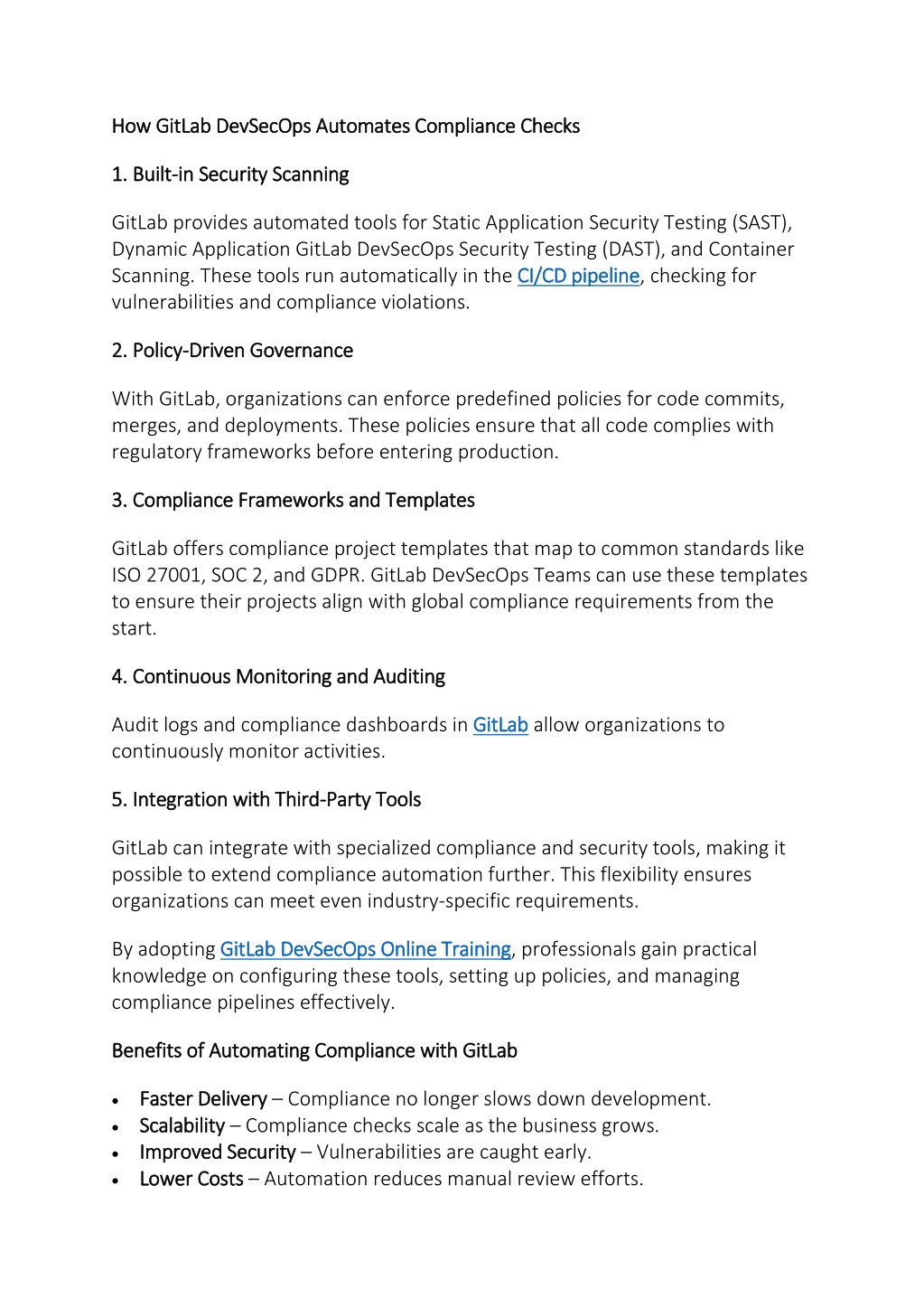 3. Audit Audit- -Ready Ready – Detailed logs simplify regulatory reporting. FAQs FAQs Q1. What makes GitLab unique for compliance automation? Q1. What makes GitLab unique for compliance automation? GitLab integrates compliance and security directly into its DevOps platform eliminating the need for multiple third-party tools. DevOps platform, Q2. Can compliance automation handle industry Q2. Can compliance automation handle industry- -specific regulations? Yes. GitLab provides GitLab DevSecOps templates and integrations that can be tailored to industry standards like HIPAA, PCI DSS, and GDPR. specific regulations? Q3. Do teams need advanced skills to use GitLab for compliance? Q3. Do teams need advanced skills to use GitLab for compliance? Basic DevOps knowledge is enough, but structured training such as GitLab DevSecOps Online Training helps teams maximize automation potential. Q4. How does GitLab reduce audit stress? Q4. How does GitLab reduce audit stress? GitLab maintains GitLab maintains audit logs and compliance dashboards, making evidence gathering for audits quick and reliable. Q5 Q5. Is GitLab suitable for both small teams and enterprises? . Is GitLab suitable for both small teams and enterprises? Absolutely. GitLab DevSecOps scales from startups to large enterprises, offering features that adapt to different organizational needs. Conclusion Conclusion Automating compliance checks is no longer a luxury it’s a necessity for organizations that want to build secure, regulation-compliant software at scale. GitLab DevSecOps makes this possible by embedding compliance policies, automated security scans, and audit-ready features into every stage of the pipeline. For professionals and organizations aiming to stay ahead in secure DevOps practices, training is crucial. Investing in DevSecOps with GitLab Training teams with the practical skills to configure, implement, and manage automated compliance efficiently. By combining the power of GitLab with skilled professionals, businesses can accelerate innovation without compromising on compliance or security. DevSecOps with GitLab Training equips